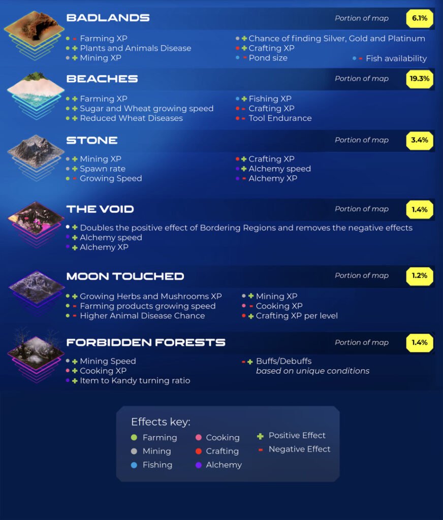 Land in the Kitsumon World comes in the form of 13 types of biomes such as forest, oasis, snow or the cursed forbidden forest. Different biomes affect players’ professions, mining in the badlands might yield more gemstones, but players can only grow the mythical space mushrooms in the moon-touched biome! Find out more about the variety of biomes here.
