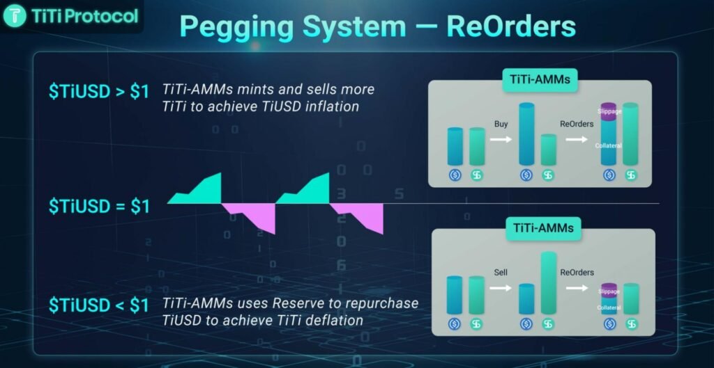 3. The Reorders can cohesively make TiUSD pegging to $1 via reshape liquidity pairs value. TiTi maintains price anchoring dynamically and effectively adjusts the supply and demand of the primary and secondary markets of stablecoins through a new supply and demand algorithm, the Reorders. TiTi induces a peg coordination mechanism, which fosters high liquidity around the peg, while curtailing speculative attacks and bank run effects with Reorders and Rain Day Fund in case coordination breaks. Another unique function is that the Reorders can curtail speculative and arbitrage from taking transaction slippage. Instead, the Reorder will proactively collect the slippage and distribute to Rain Day Fund and Protocol fee, thus benefit protocol users rather than speculators.